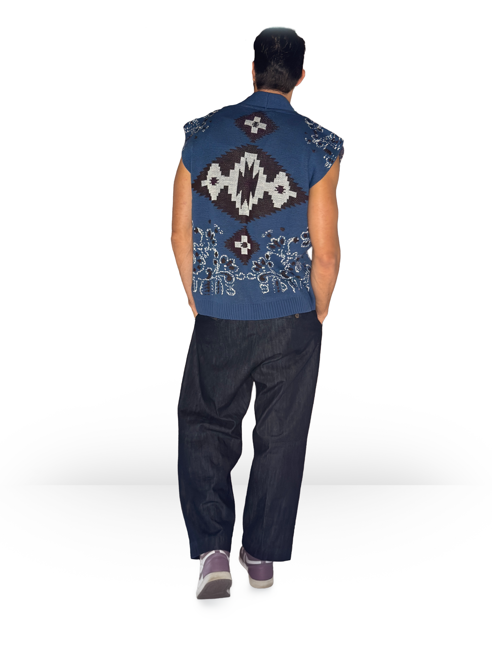 Smanicato in lana con stampa Navajo, bottone in metallo con dettaglio turchese, collo a scialle, veste regular.