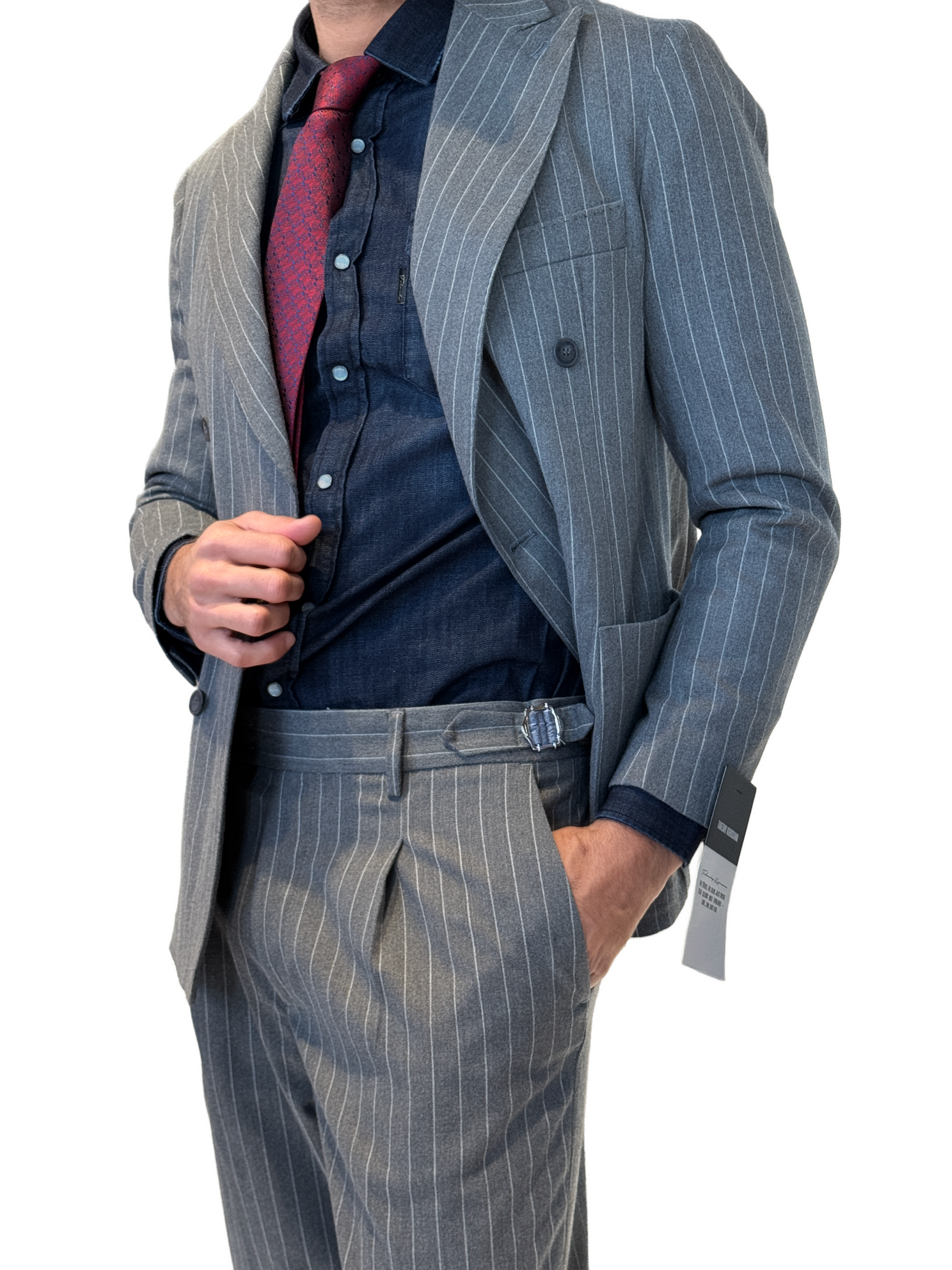 Abito in lana gessato grigio, giacca doppio petto, pantalone con fibbie laterali e doppio bottone di chiusura.