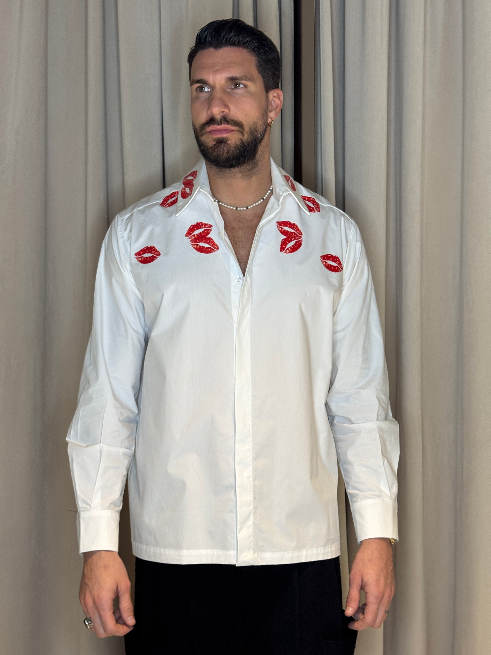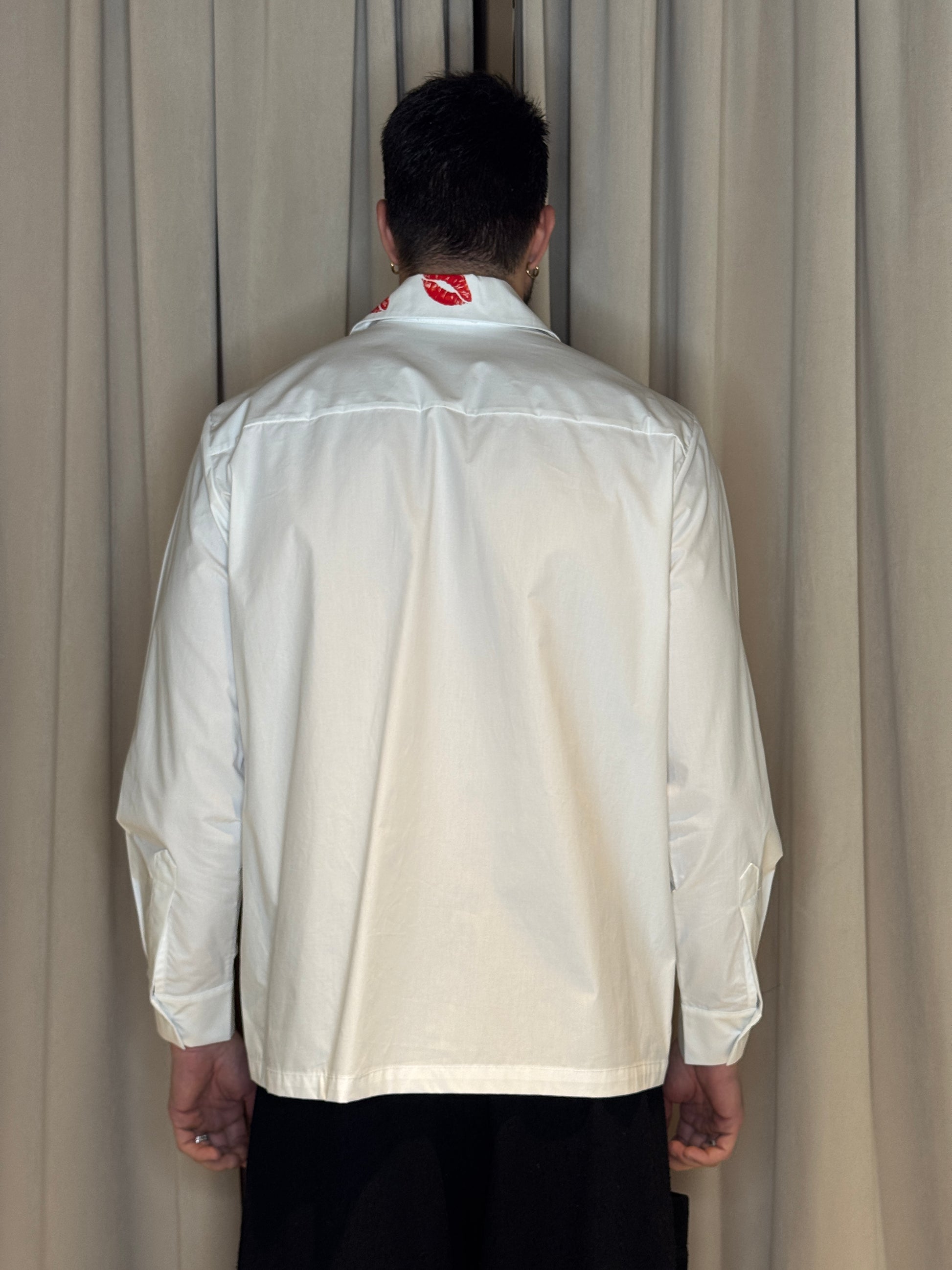 Camicia 100% cotone, veste over, fondo dritto, presenta dei baci sulla parte alta.