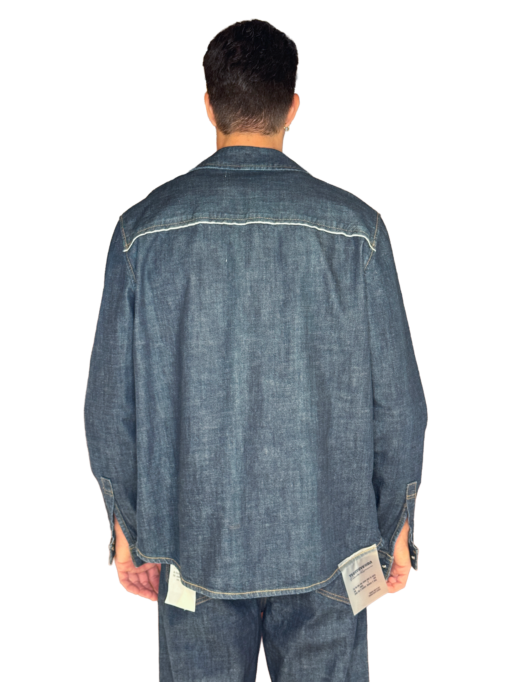 Camicia over in denim blu cimosato, bottone in madre perla.