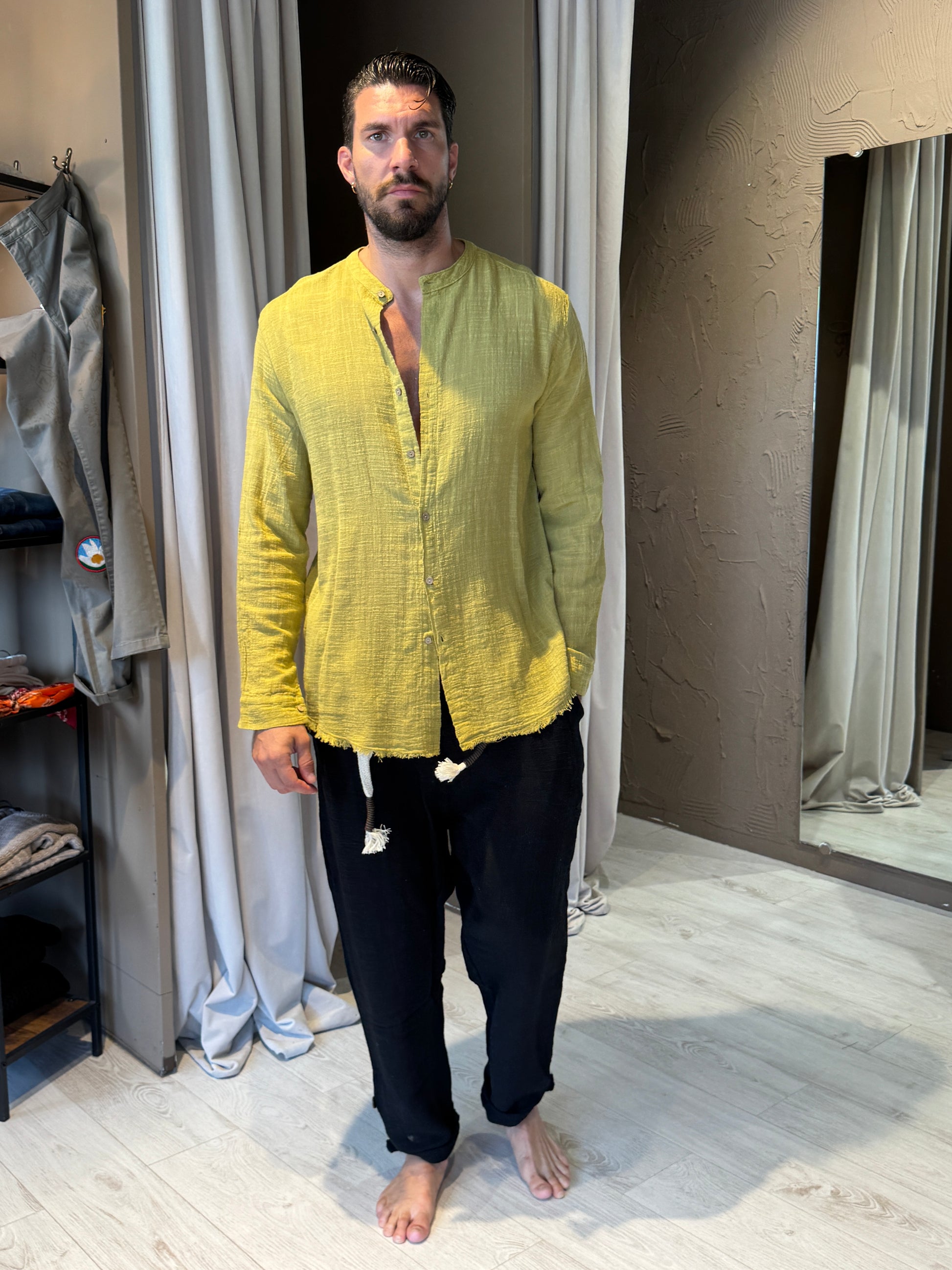 Camicia in lino molto leggera, il fondo è sfrangiato, collo a coreana, bottone in legno.