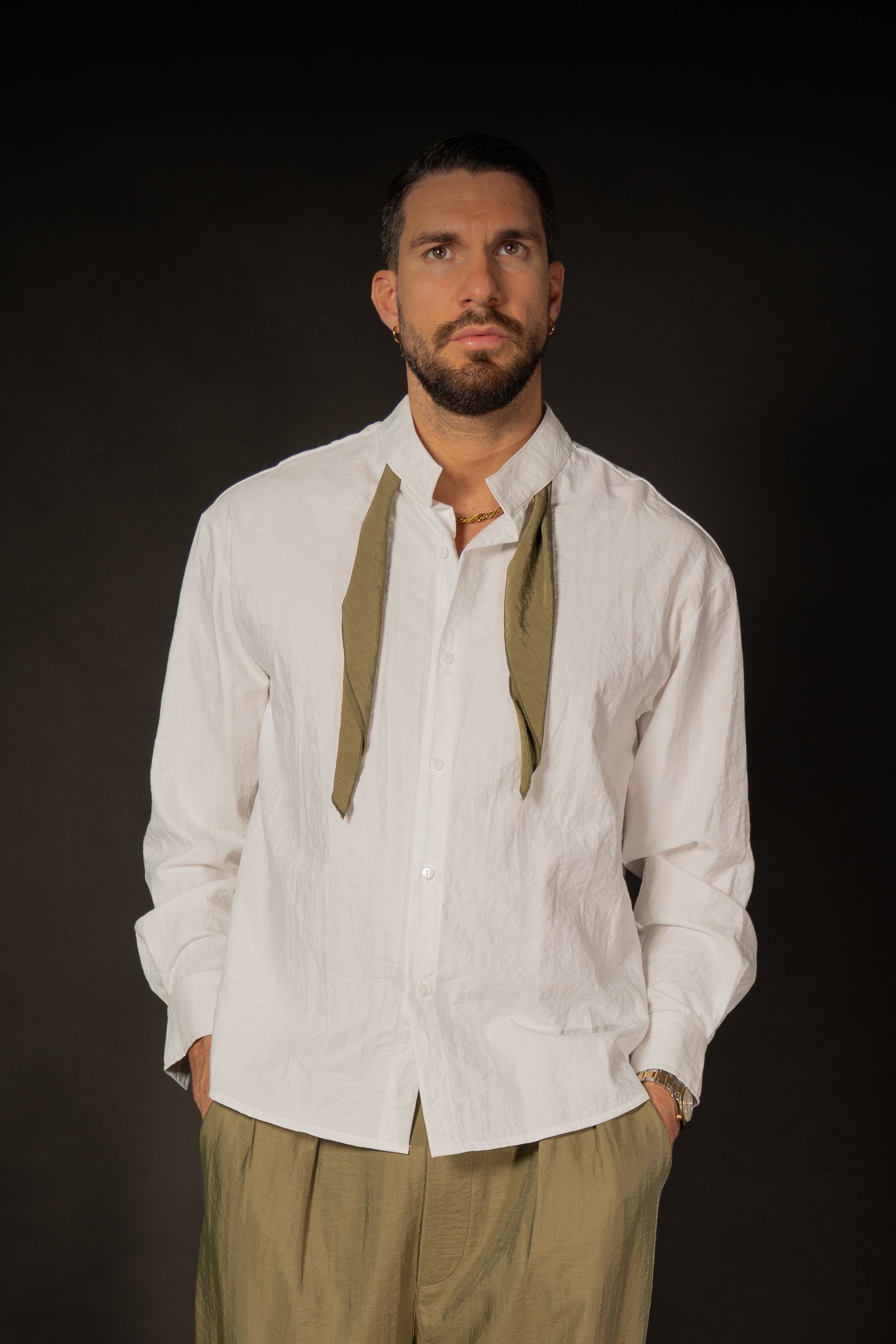 Camicia in tessuto tecnico bianco, con foulard applicato del colore che riprende il pantalone Turandout, veste leggermente over, collo a coreana.