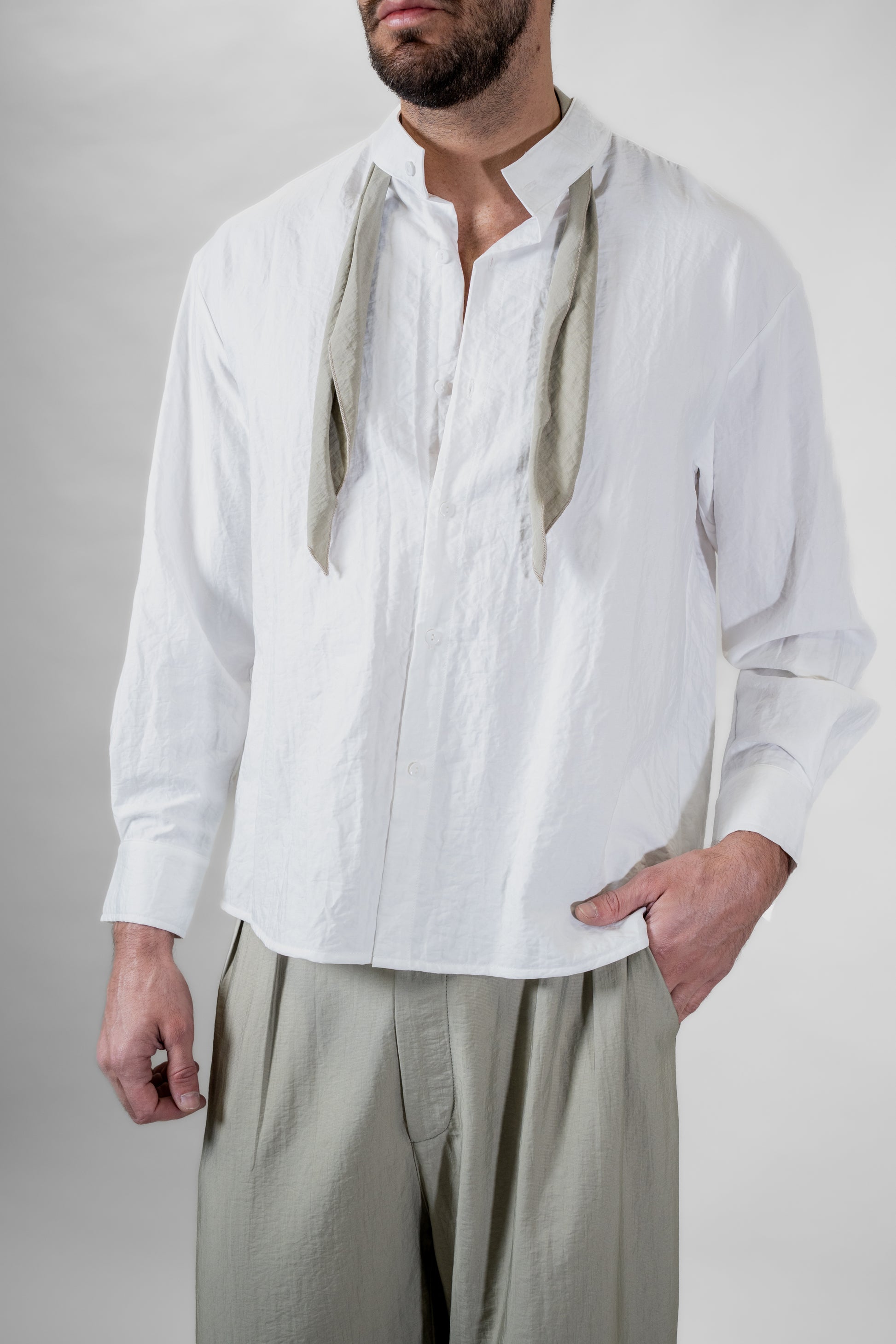 Camicia in tessuto tecnico bianco, con foulard applicato del colore che riprende il pantalone Turandout, veste leggermente over, collo a coreana.