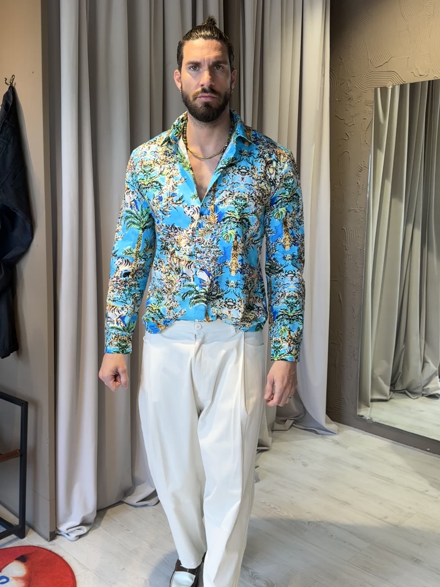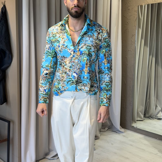 Camicia 100% viscosa in fantasia, veste leggermente morbida.