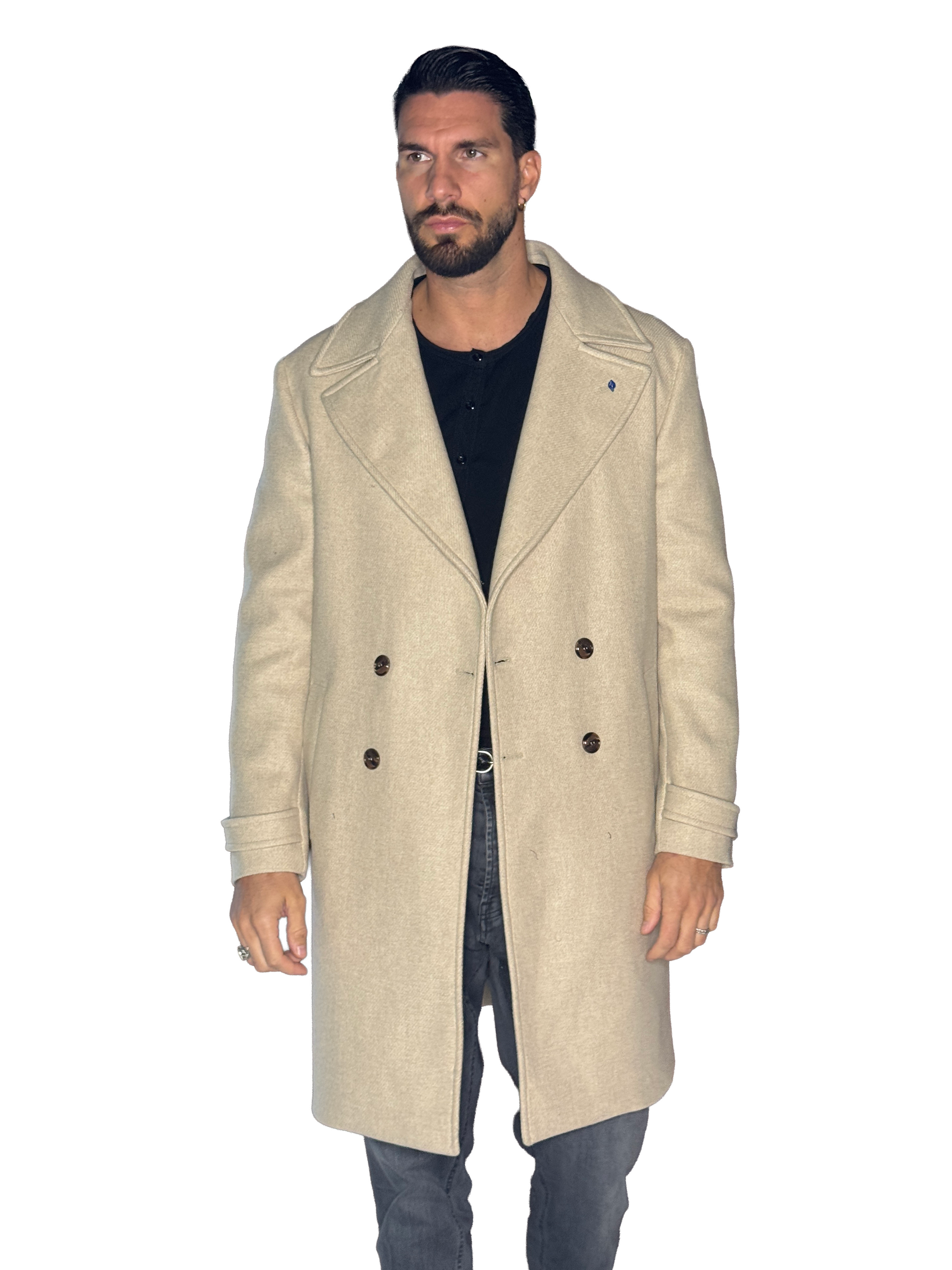 Cappotto baronetto doppio petto revere punta a pancia largo, veste regular, presenta la martingala dietro.