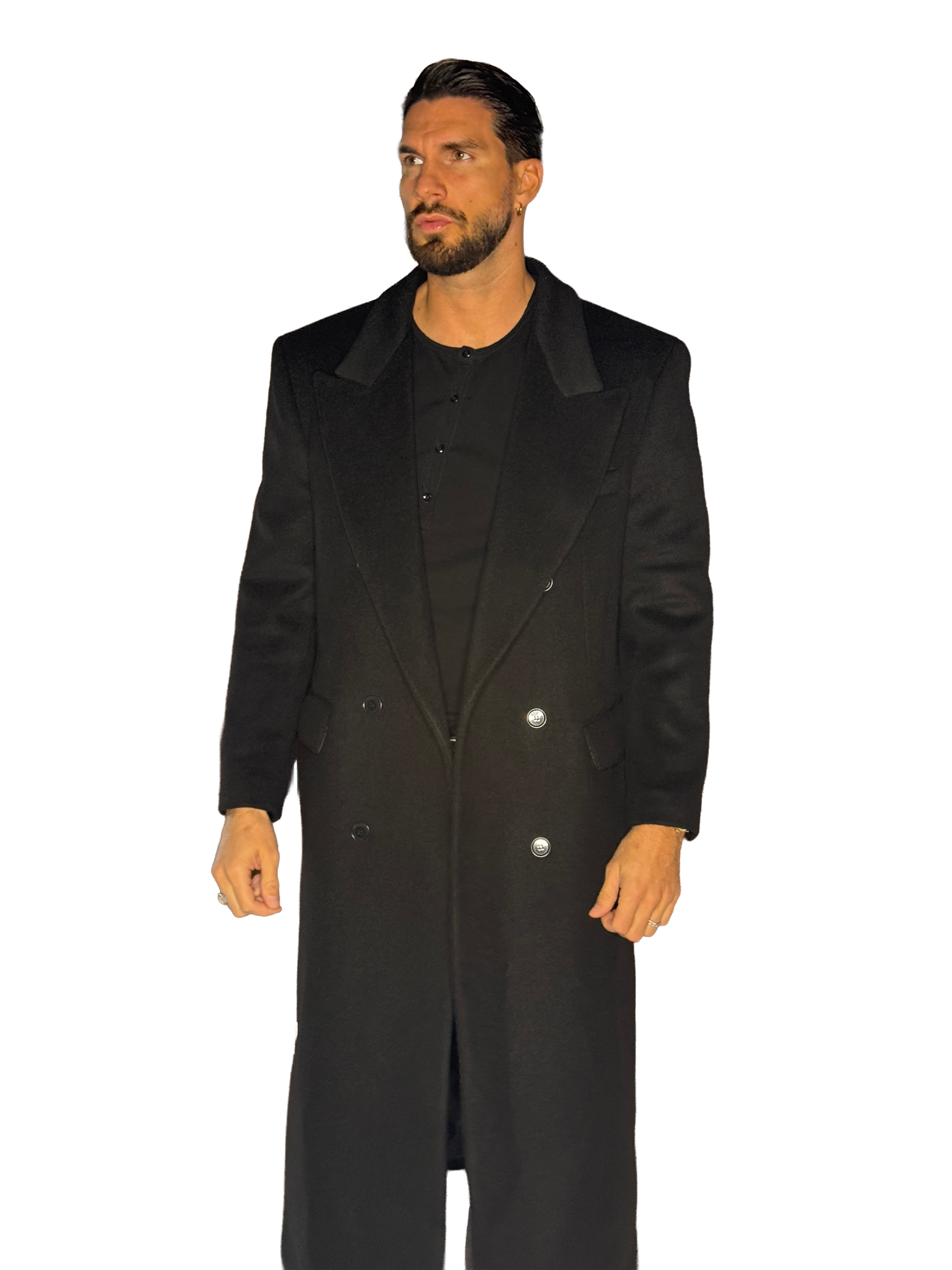 Cappotto in lana color nero, doppio petto, revere ribassato a lancia largo, lunghezza sotto il ginocchio veste regular.