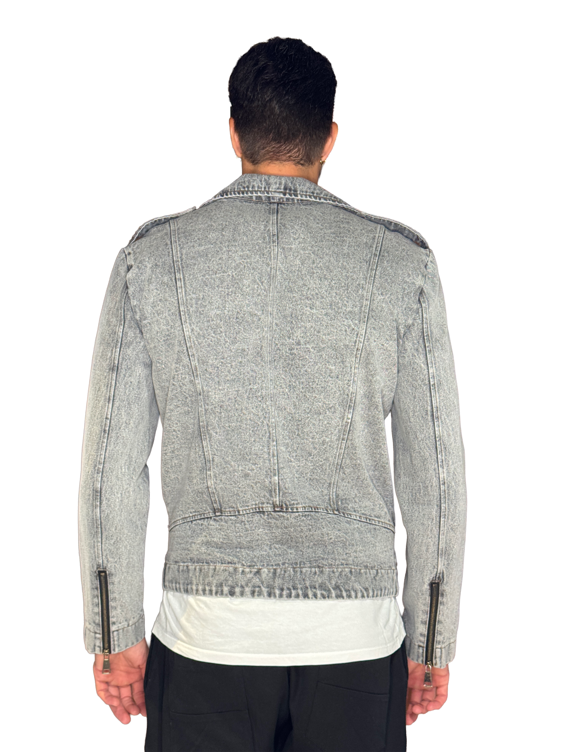 Chiodo in denim marmorizzato, veste leggermente morbido. E’ taglia unica
