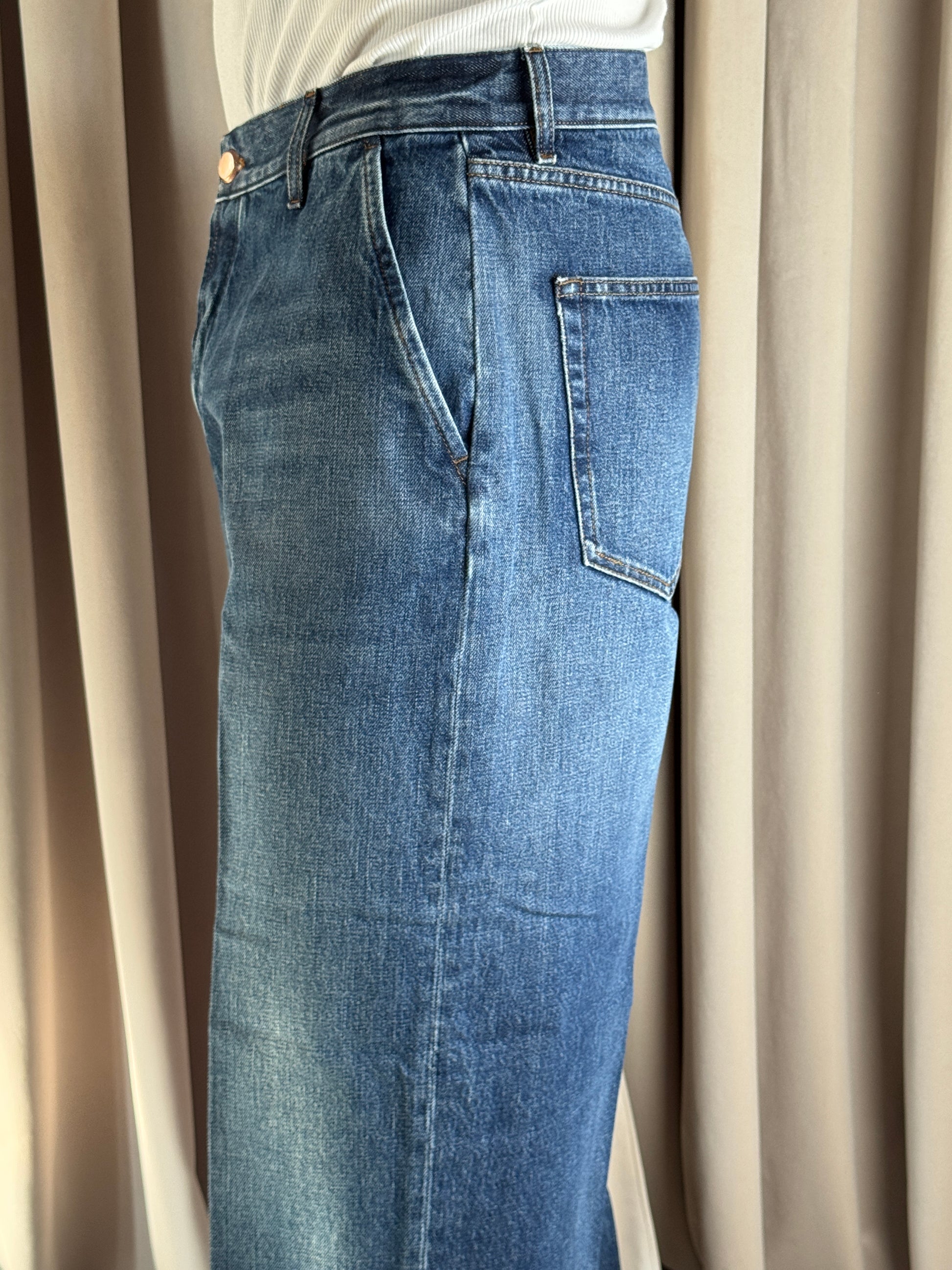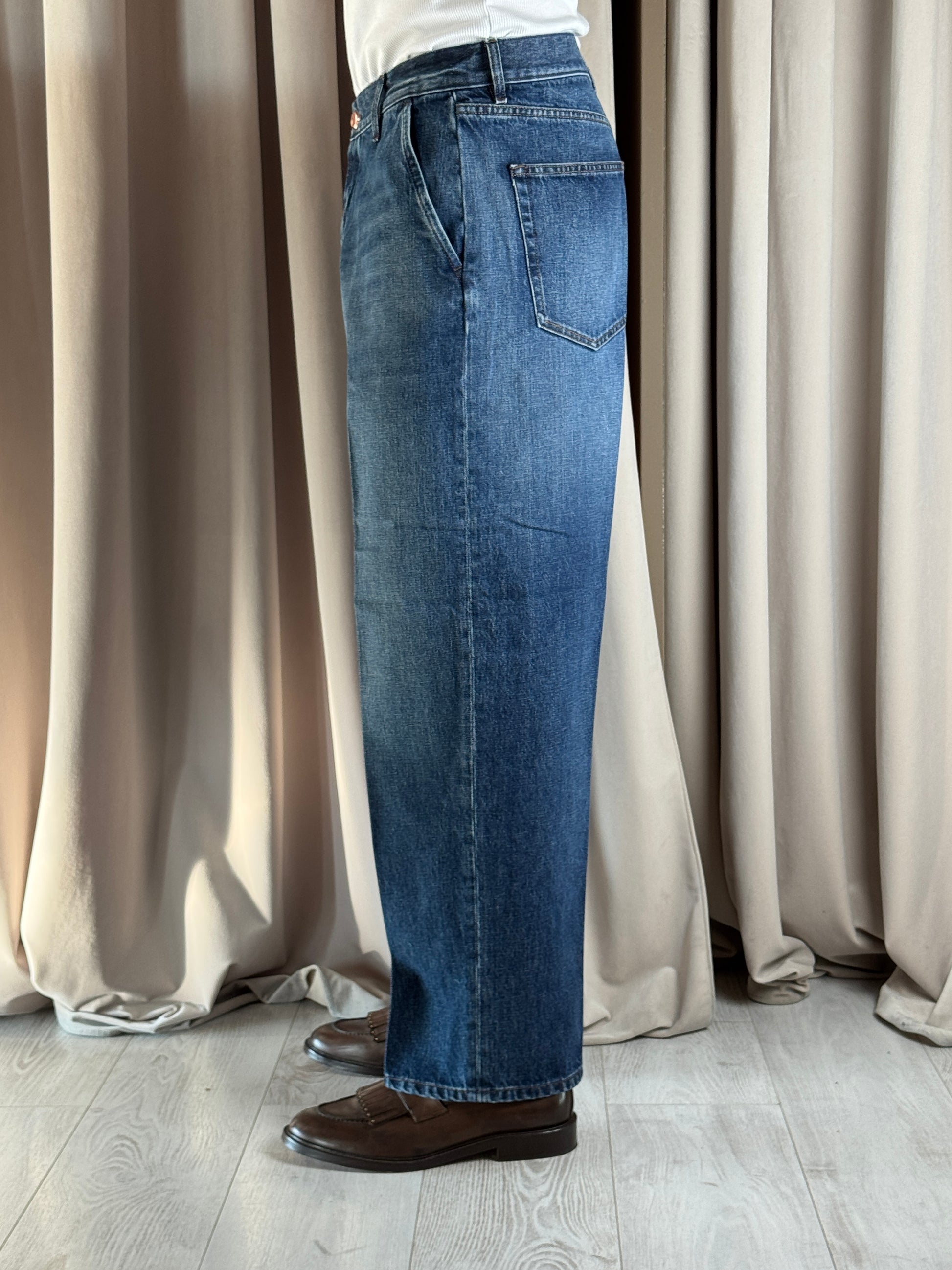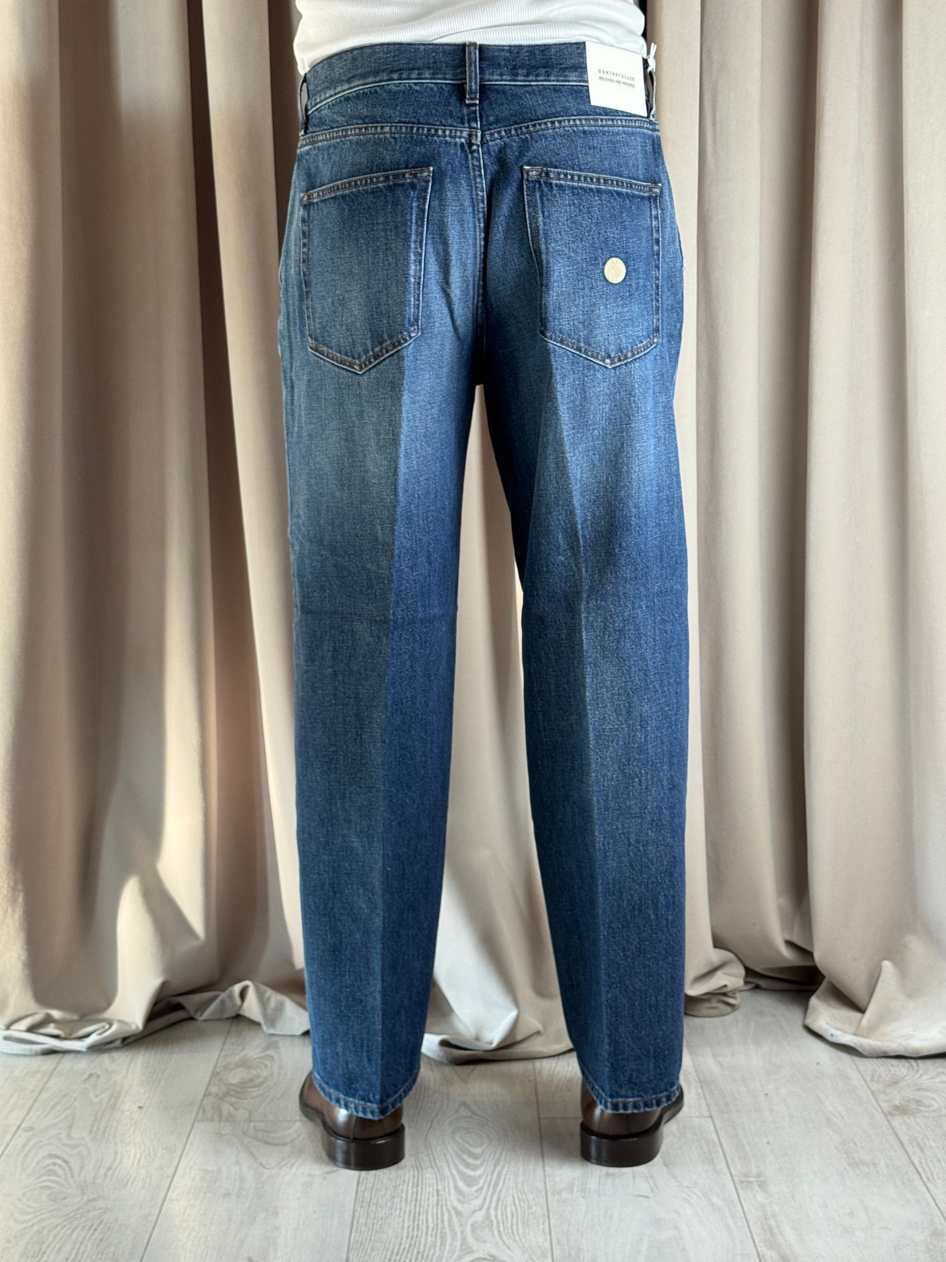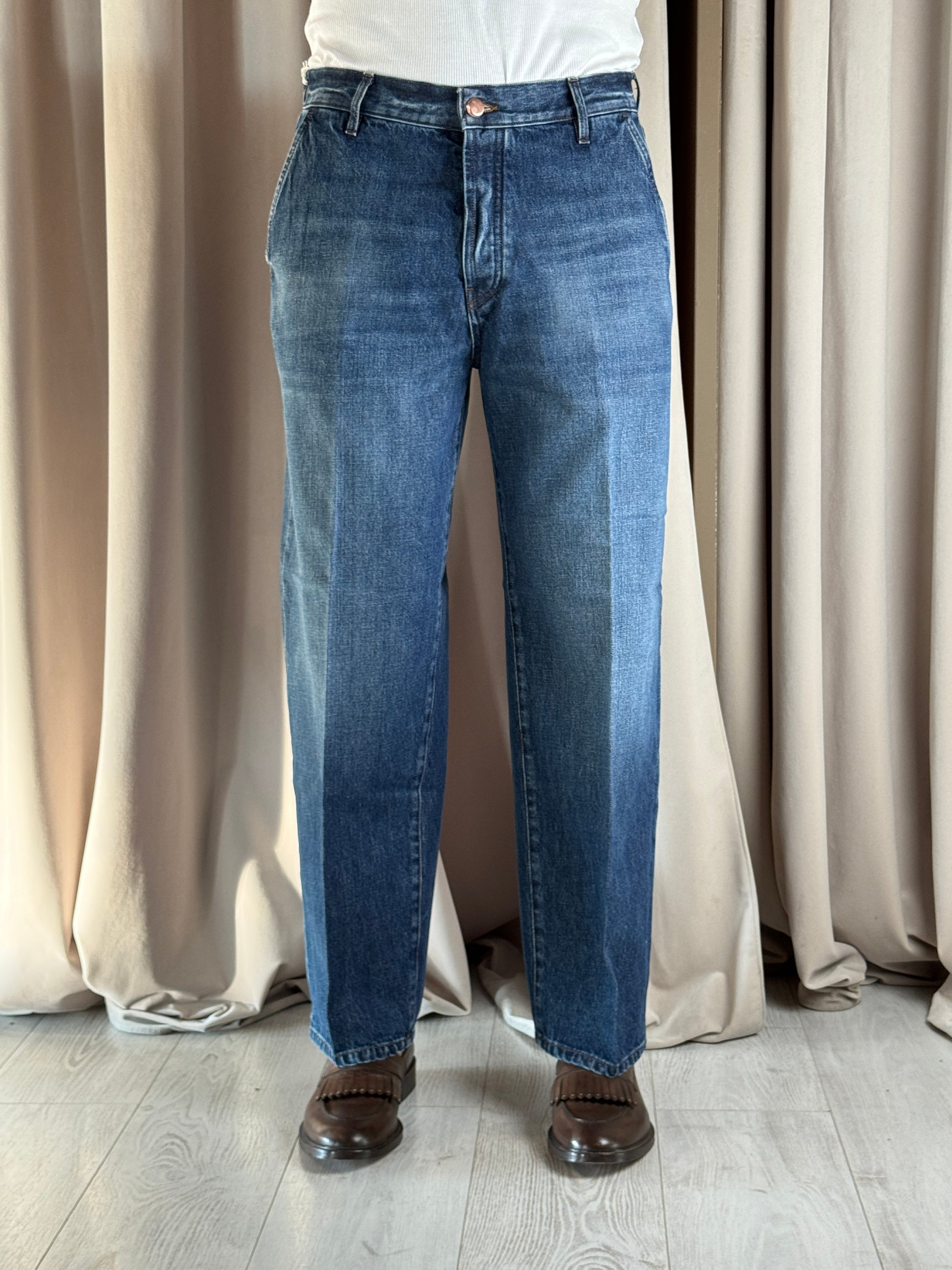 Denim modello Austin, lavaggio vintage, tasca America, gamba e fondo largo.
