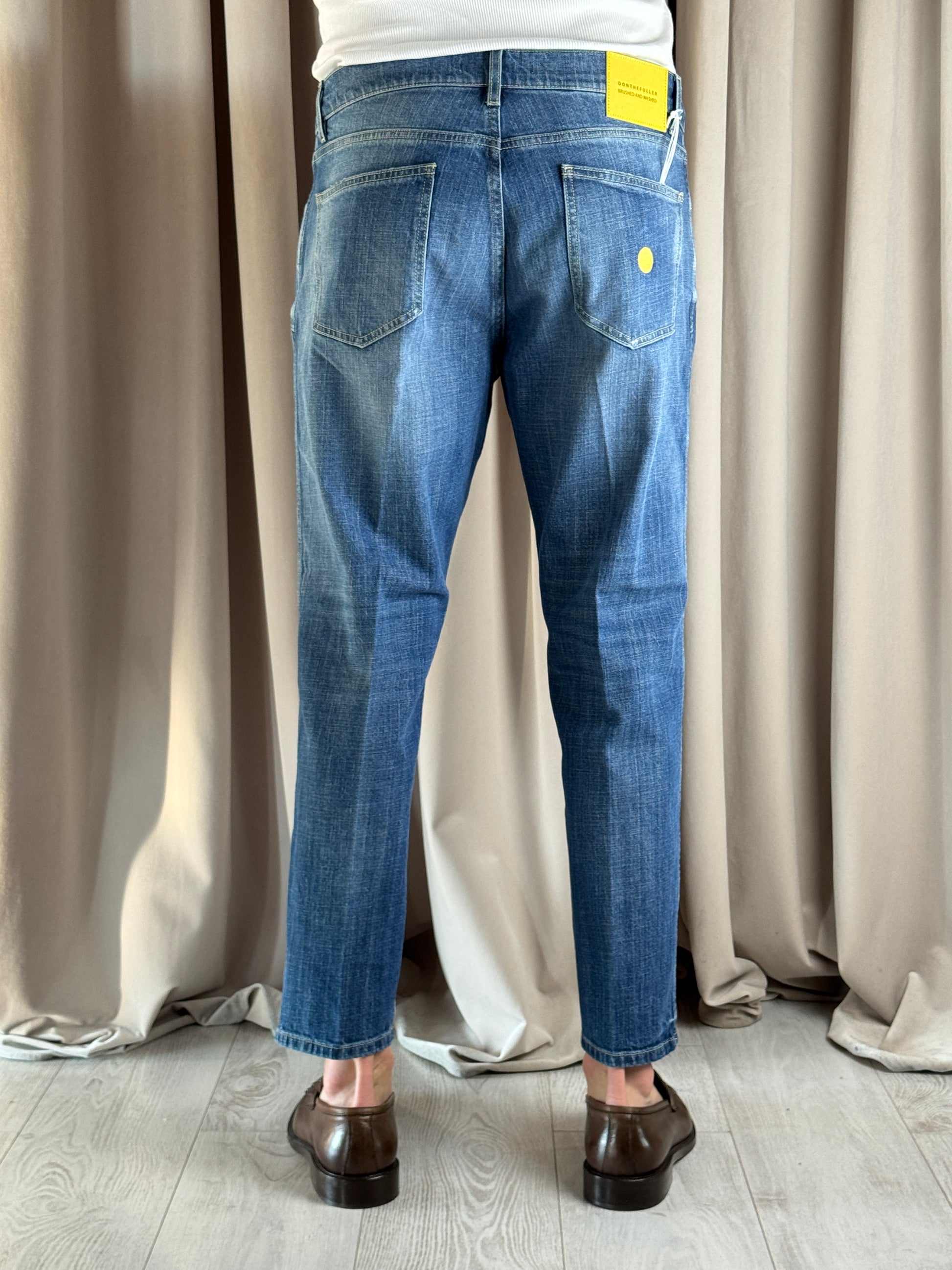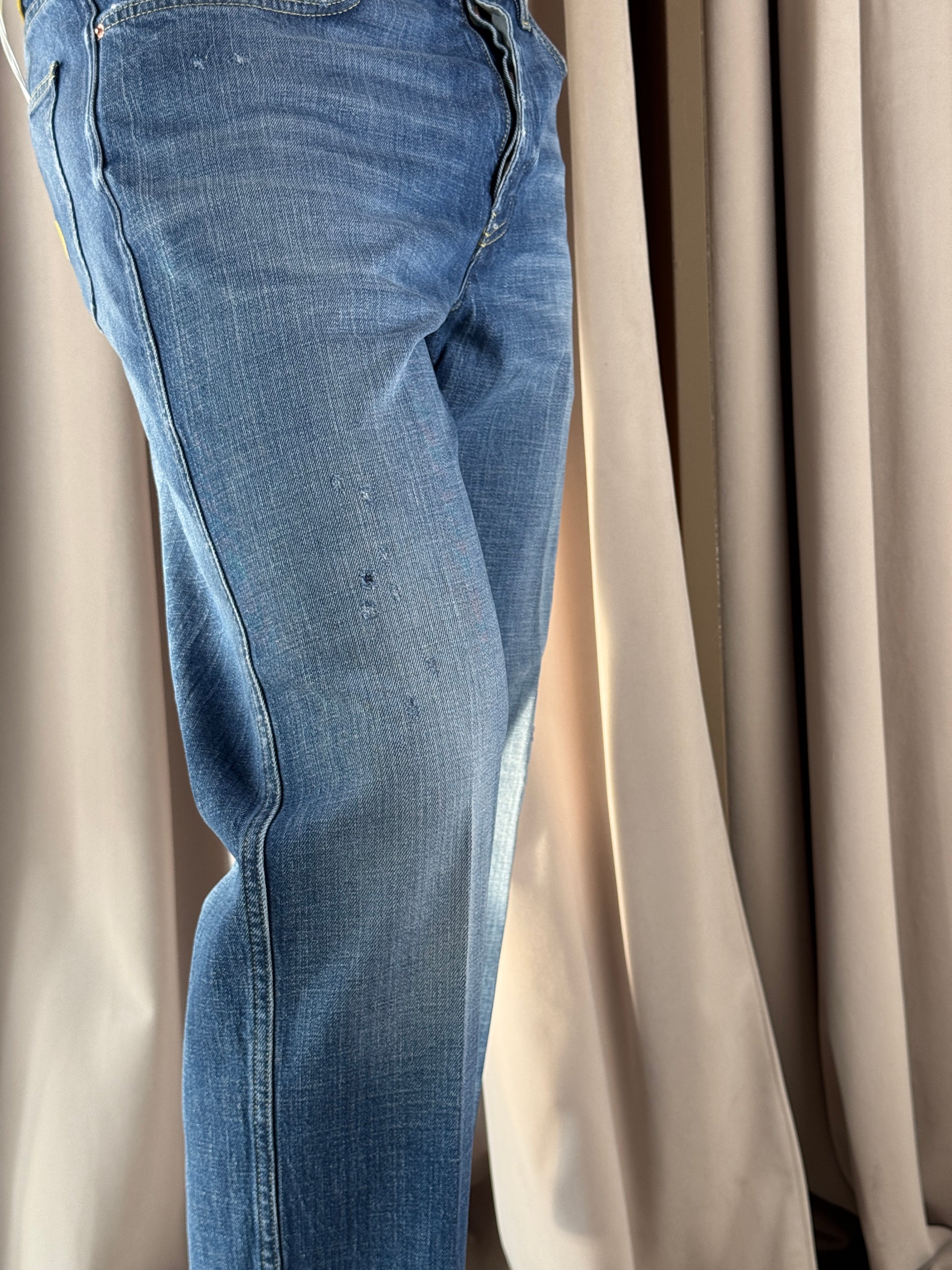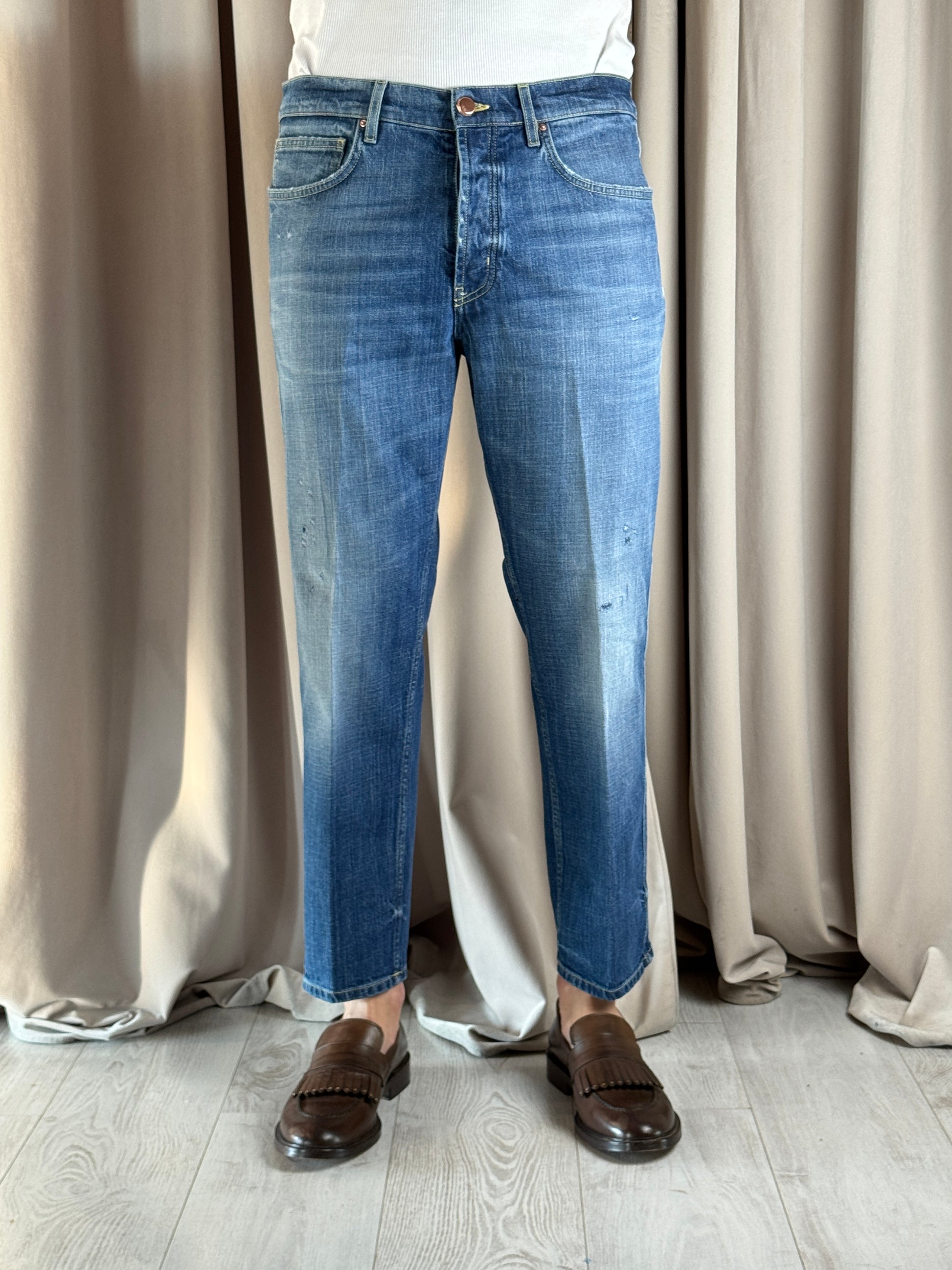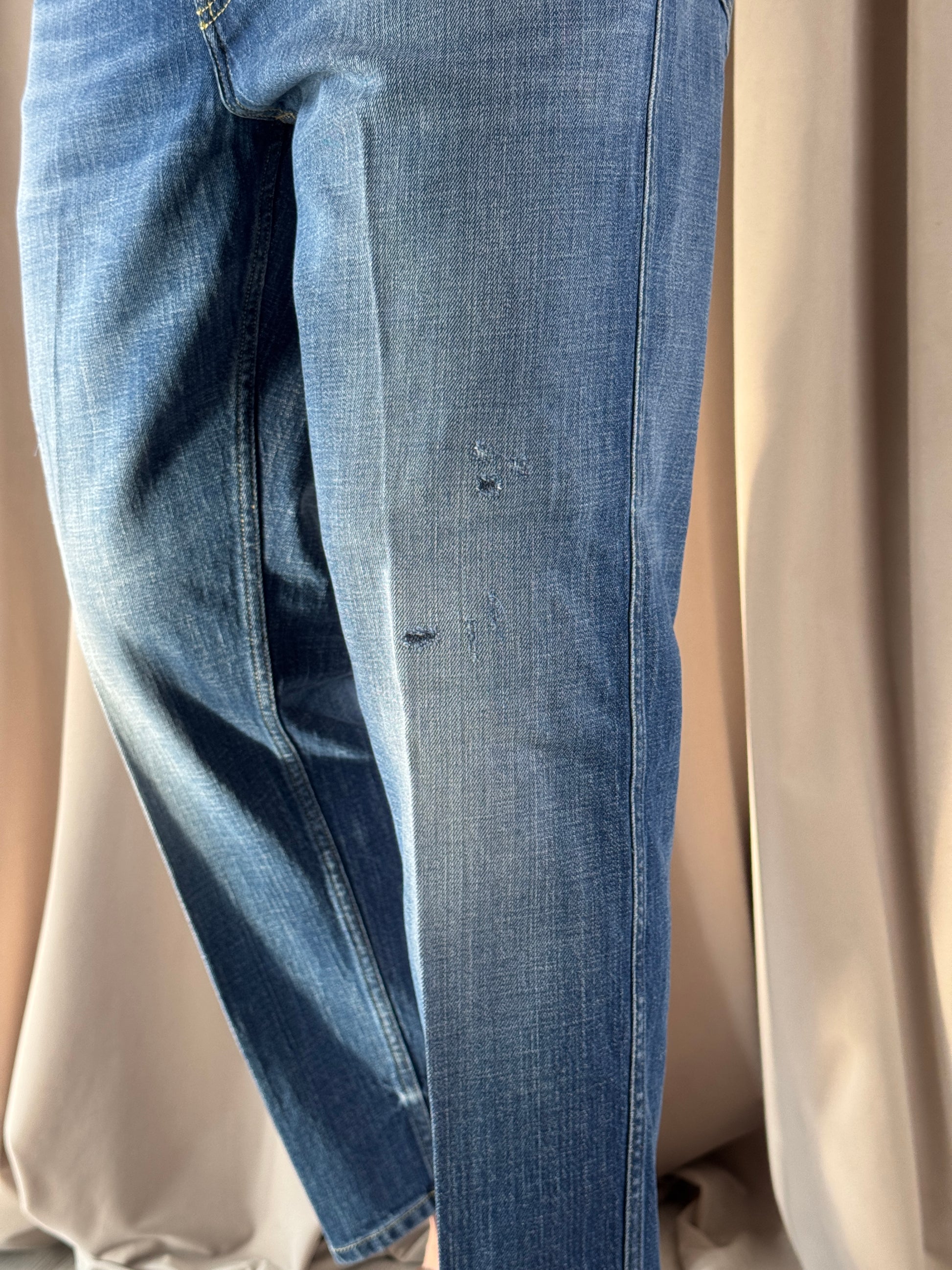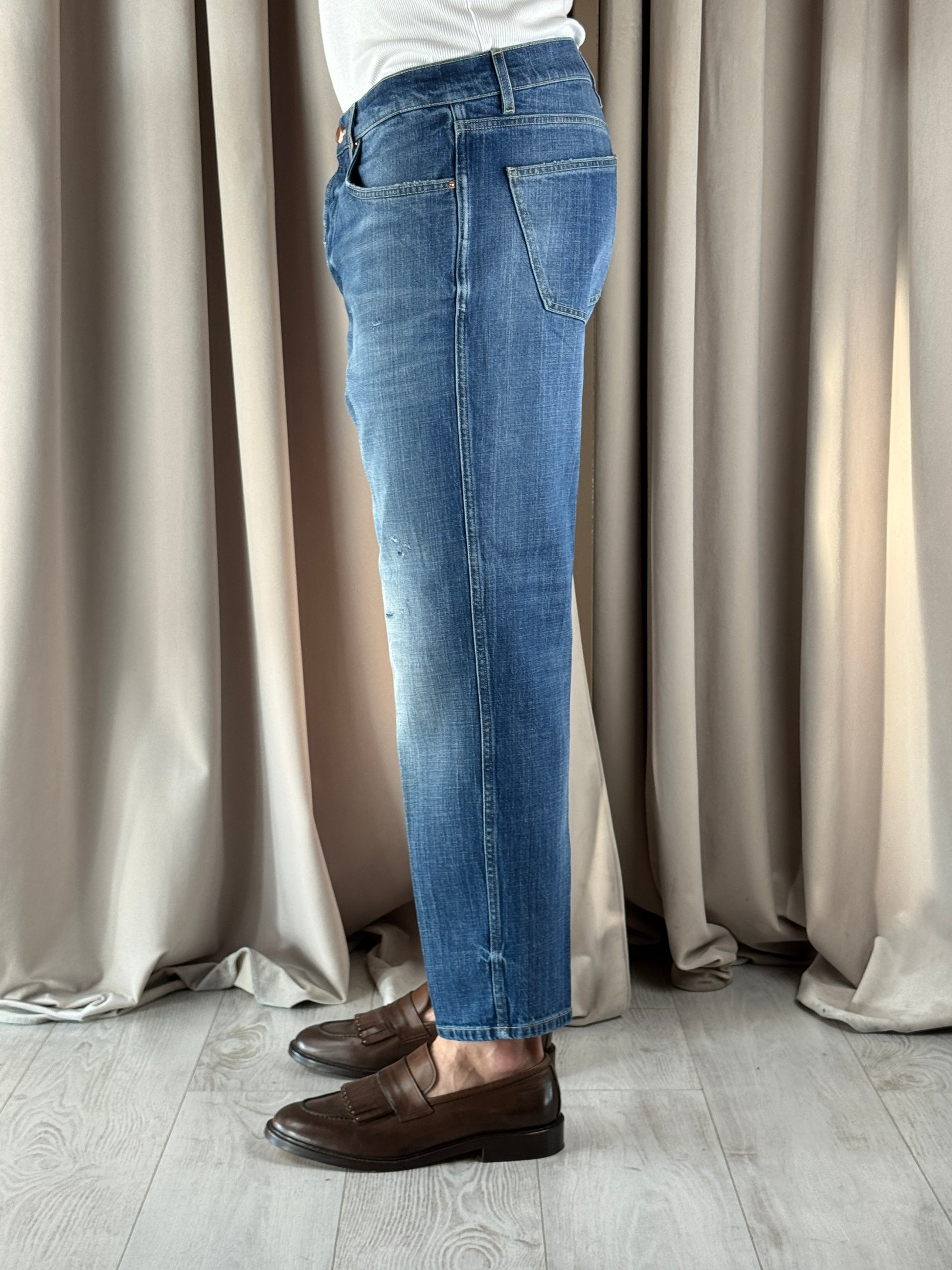 Denim lavaggio medio, modello Seoul veste cavallo leggermente sceso coscia morbida e fondo più stretto, presenta delle microrotture ramendate.