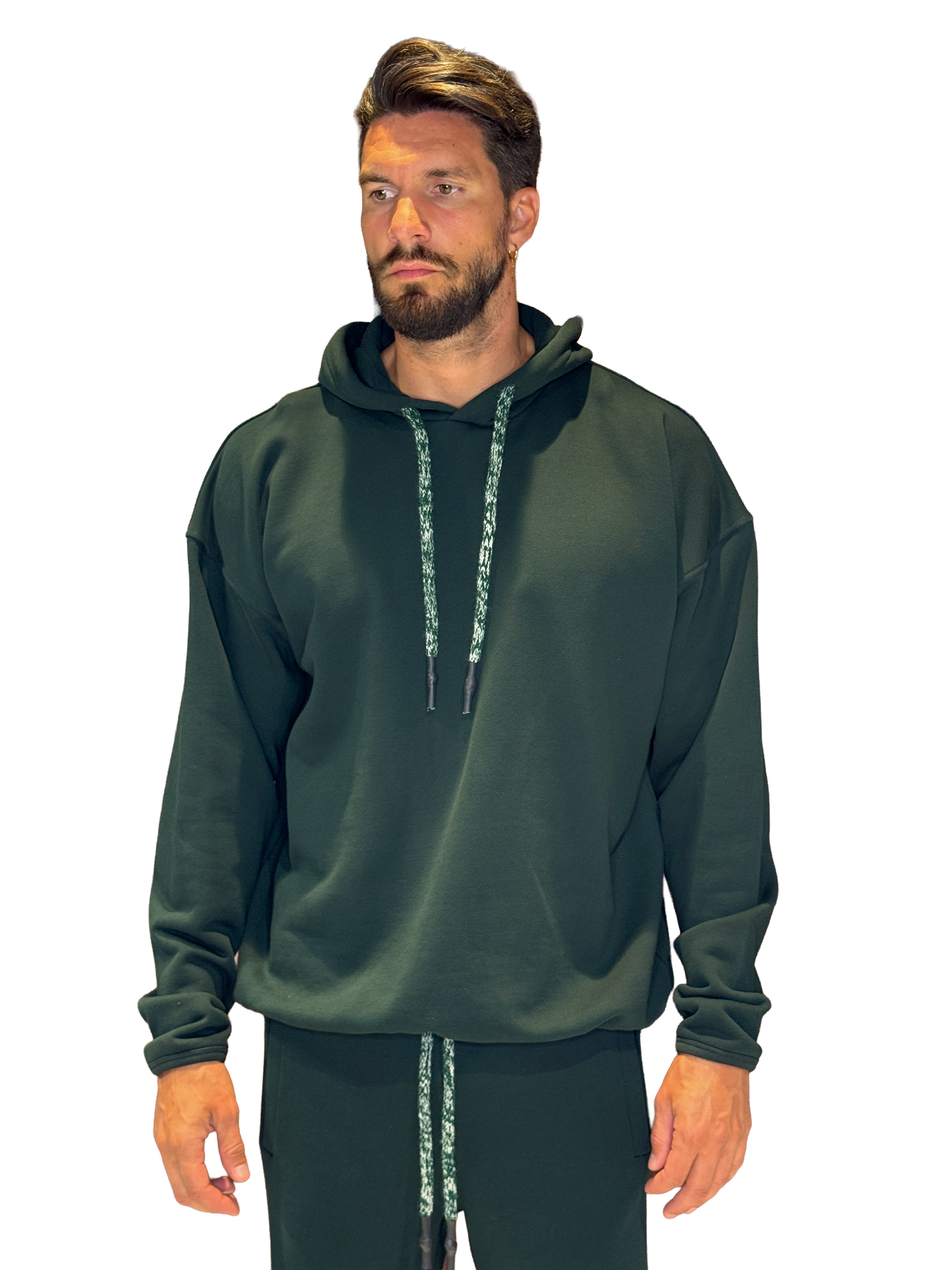 Felpa con cappuccio, spalla scesa, vestibilità over, cotone garzato, laccio in lana.