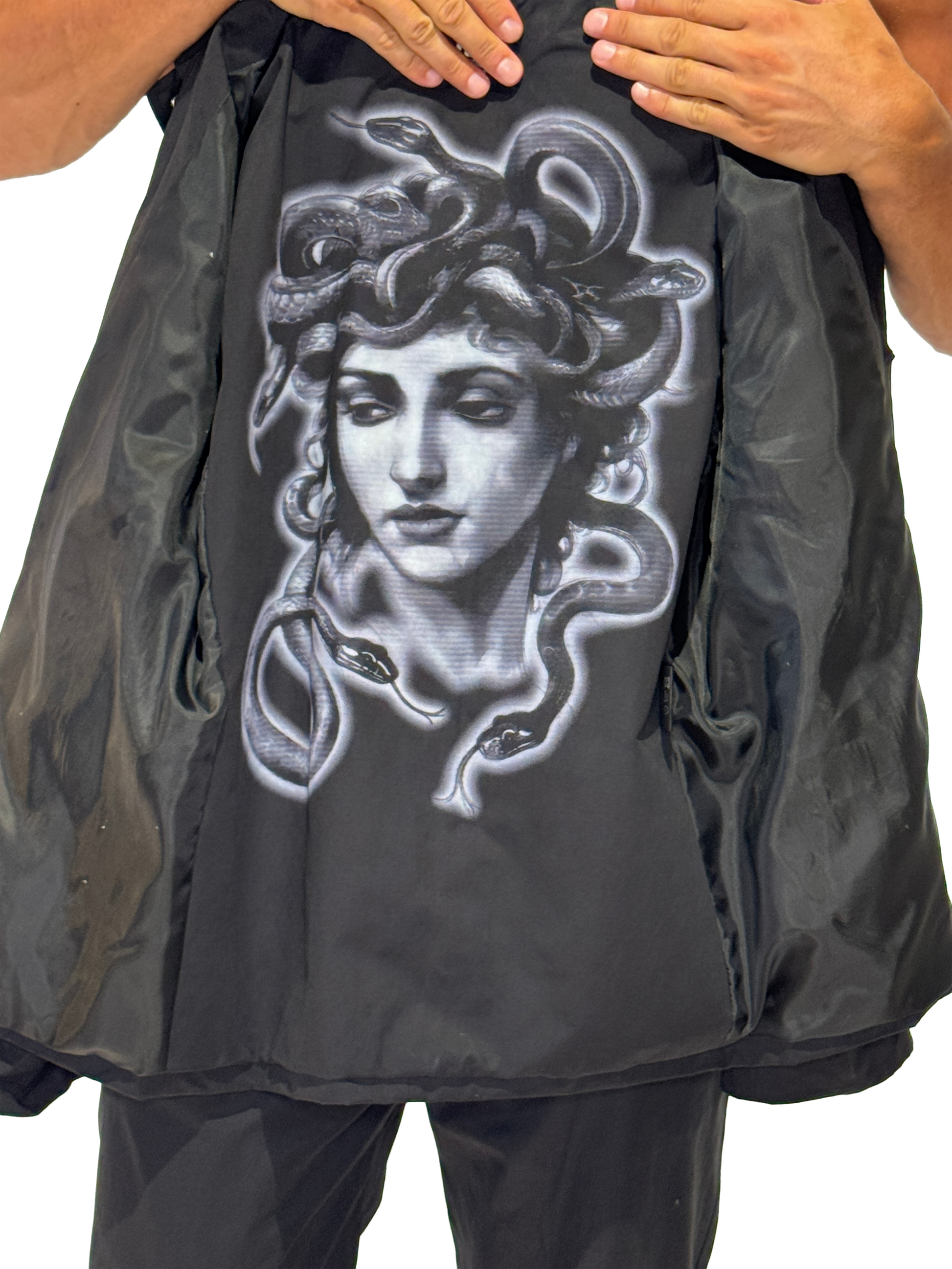 Giacca-camicia, bottone in metallo argento, all'interno ha un disegno che rappresenta la Medusa, collo coreano, 100% cotone, ottima da usare sia come giacca che come camicia.