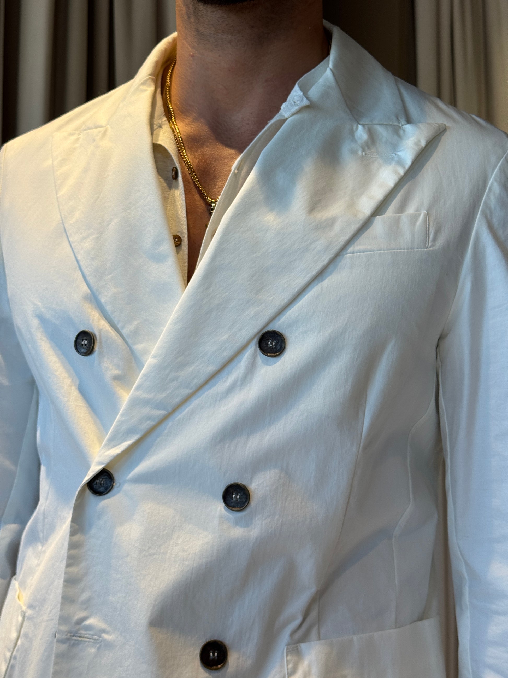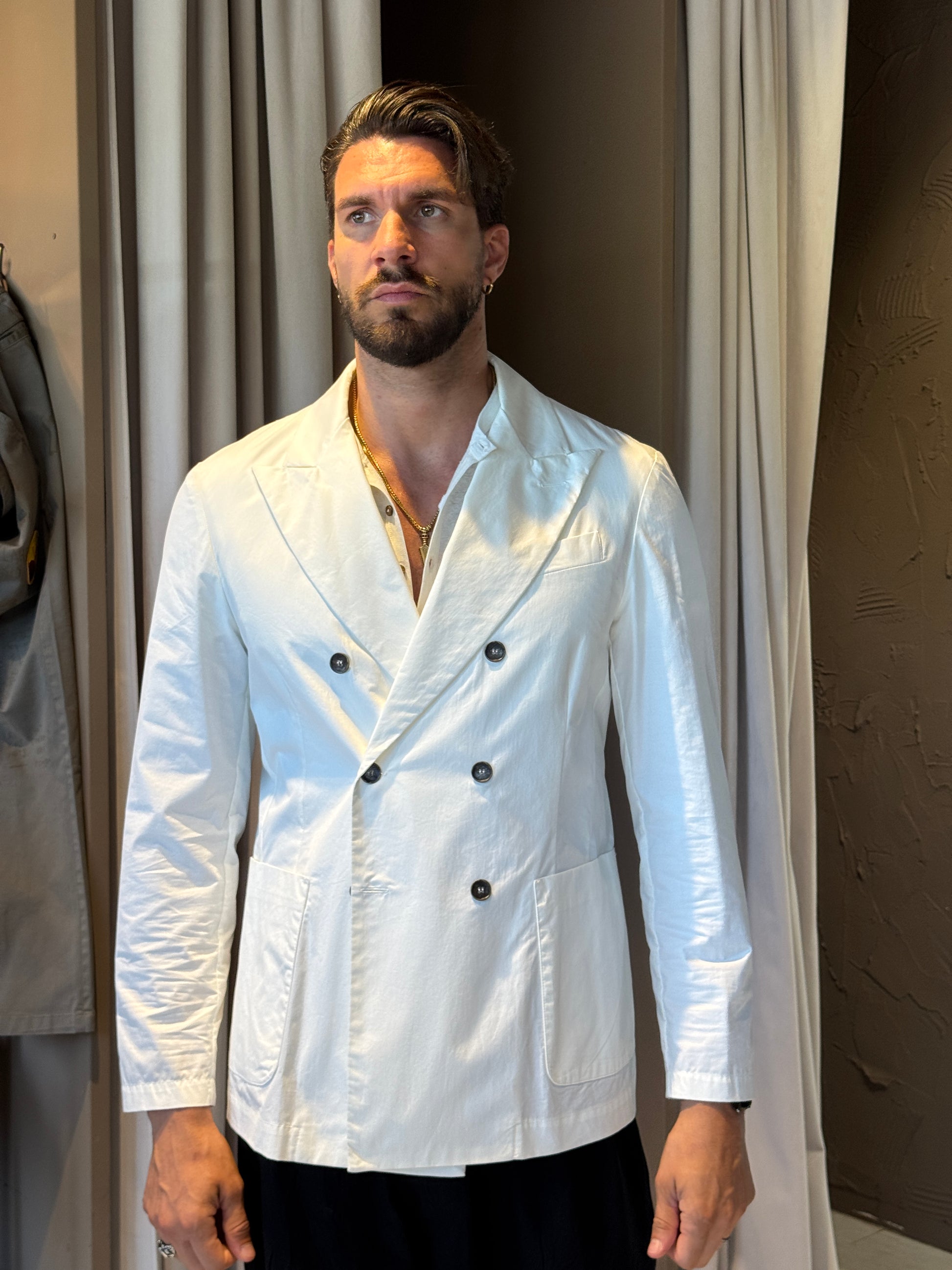 Giacca doppio petto 100% cotone veste sfiancata, le cuciture dentro tutte finite a pulito, bottone in metallo, revere a lancia tasca a toppa.