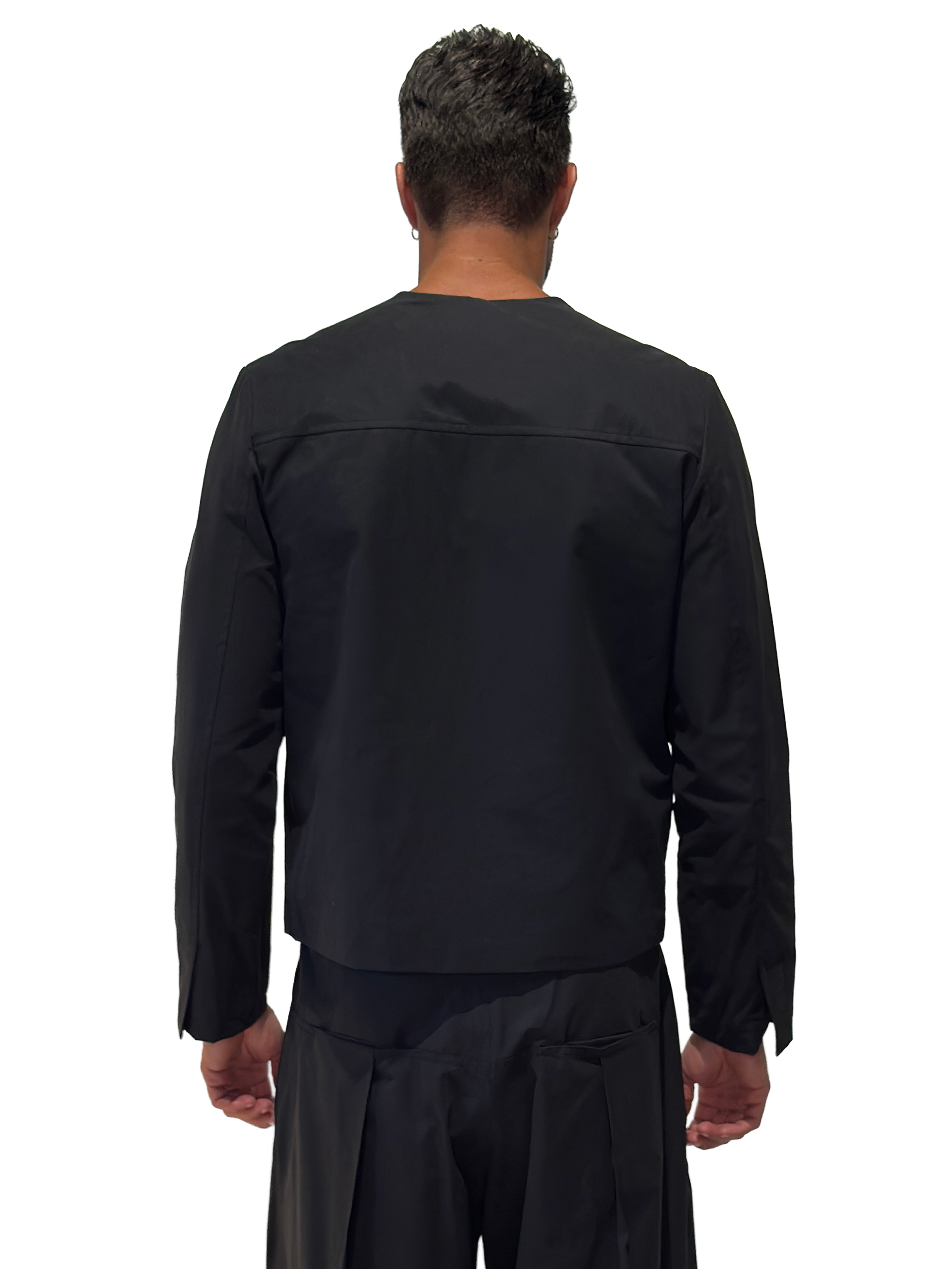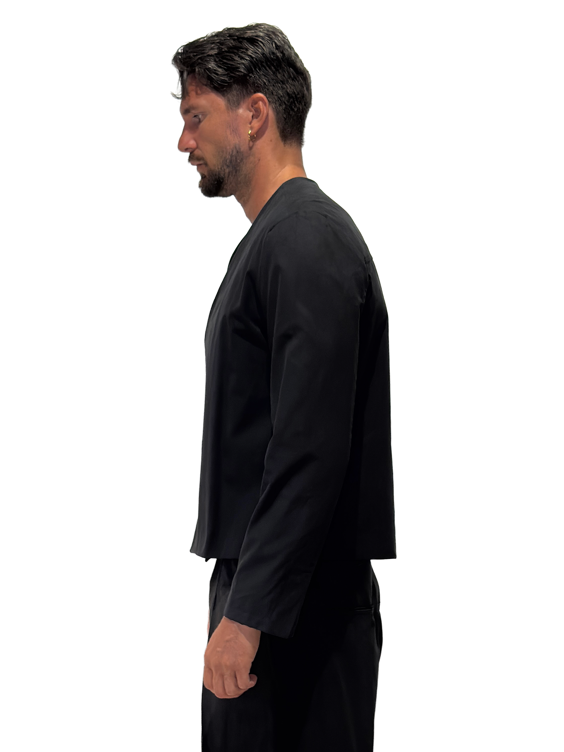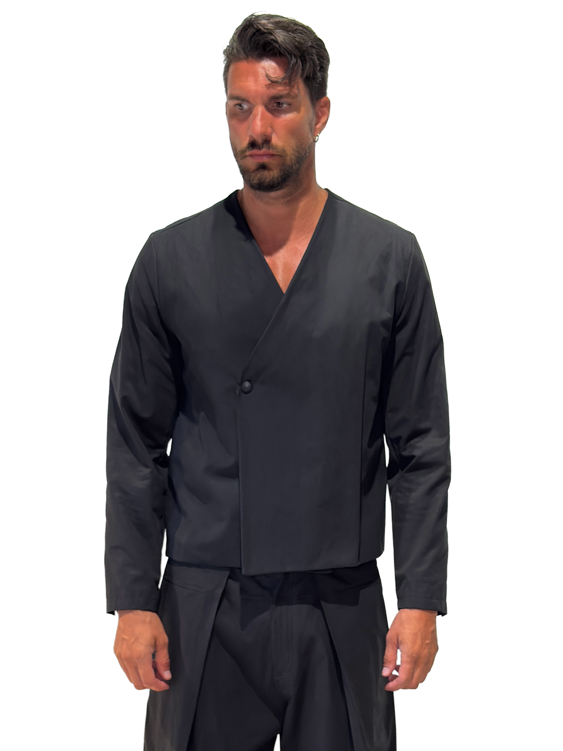 Giacca 100% cotone, veste corta in vita e morbida, presenta un bottone a pressione, scollo a V. Da abbinare al pantalone Japan.