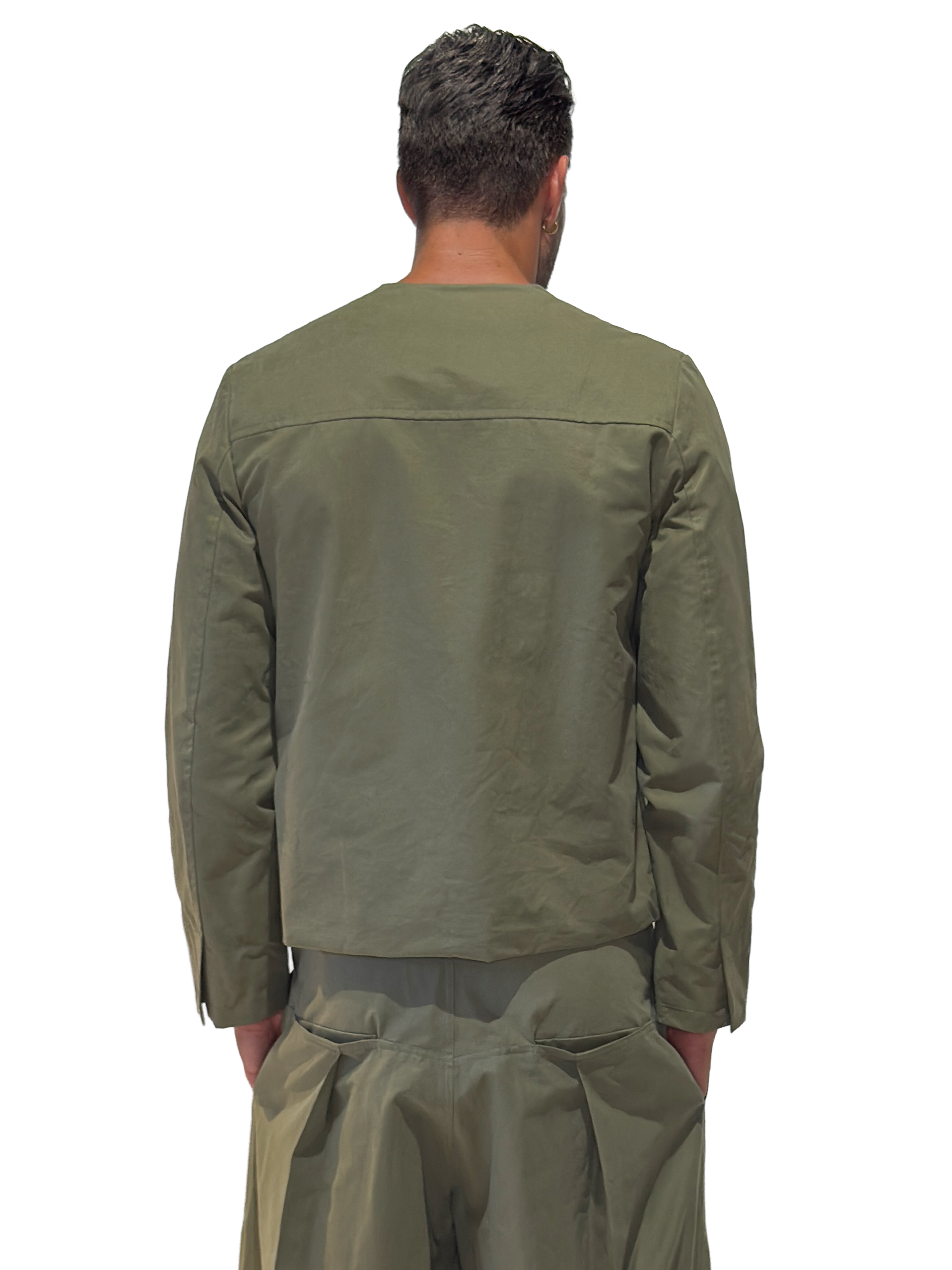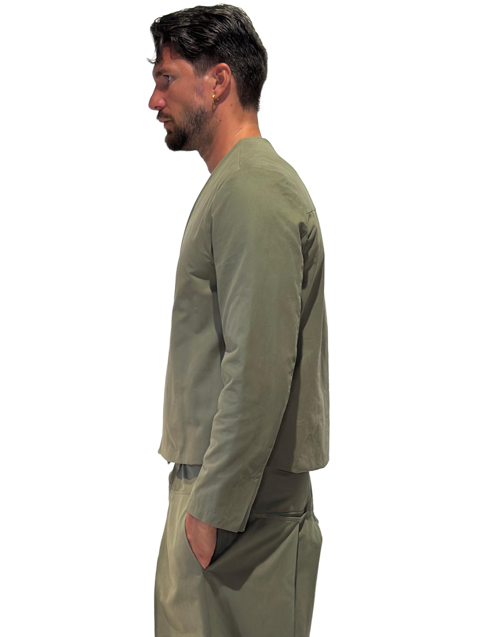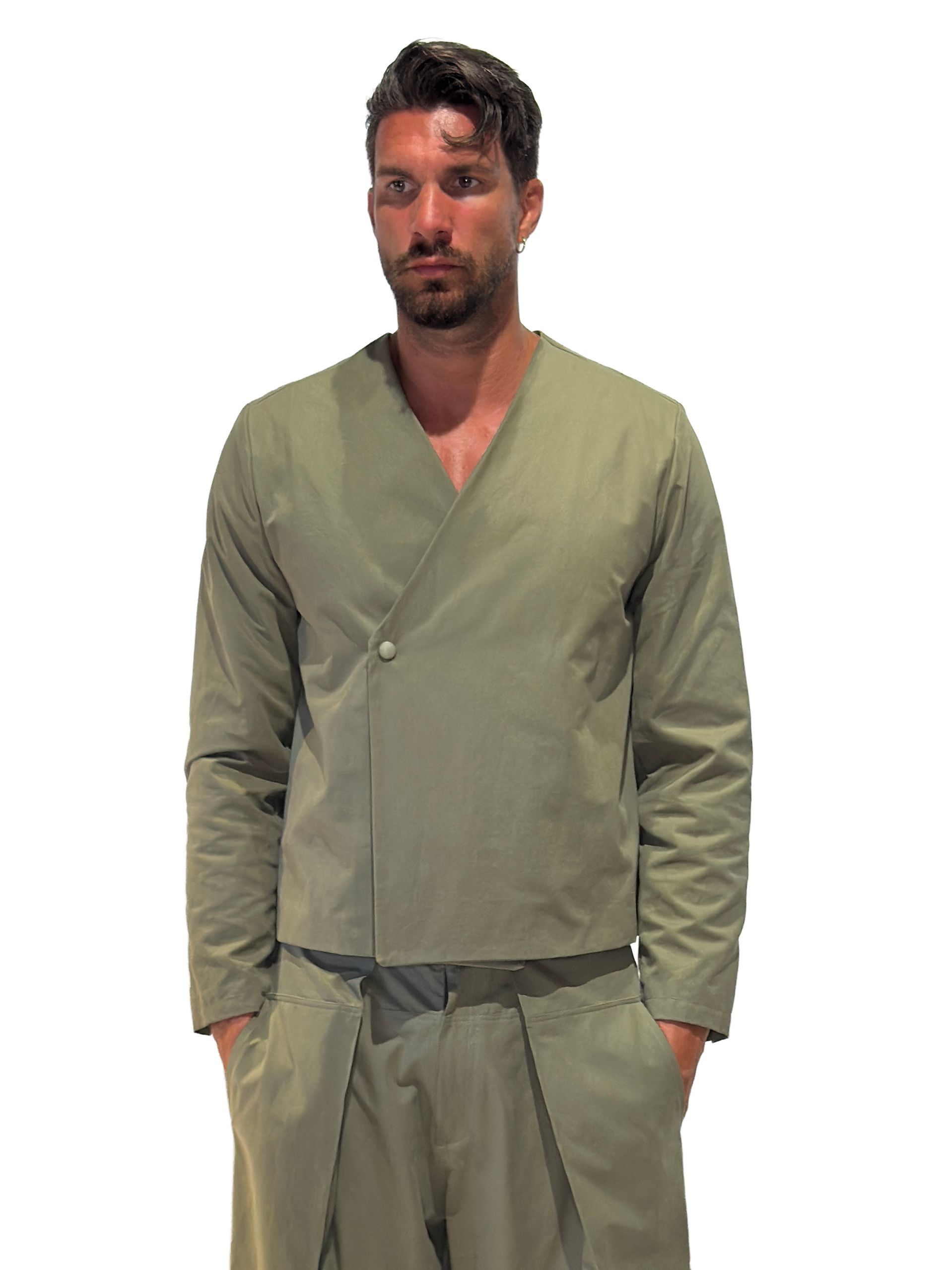 Giacca 100% cotone, veste corta in vita e morbida, presenta un bottone a pressione, scollo a V. Da abbinare al pantalone Japan.