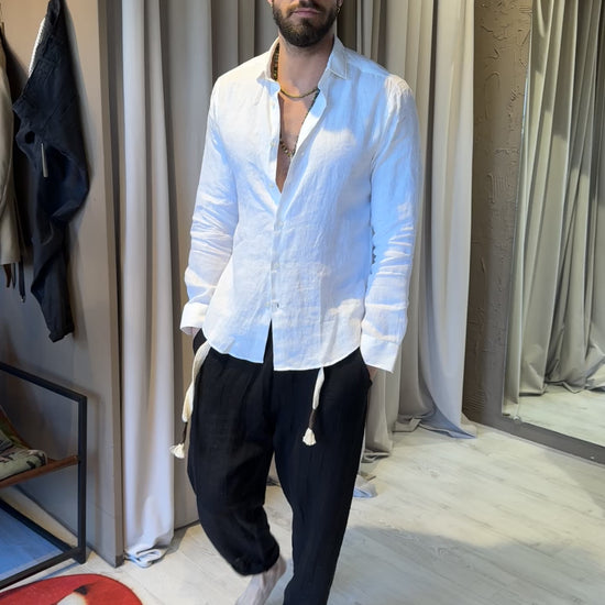 Pantalone in lino con corda in vita,veste morbido, sul fondo presenta dei bottoni per regolare la lunghezza.