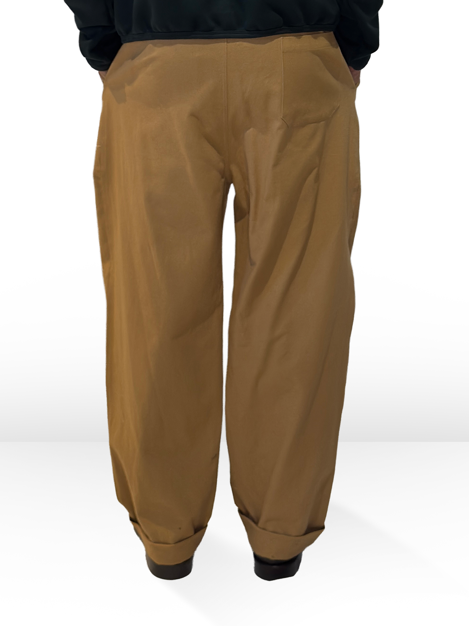 Pantalone 100% cotone mano pesca, vita metà fissa e metà con elastico così risulta più comodo, passanti con bottone, una pence, fondo 25cm.